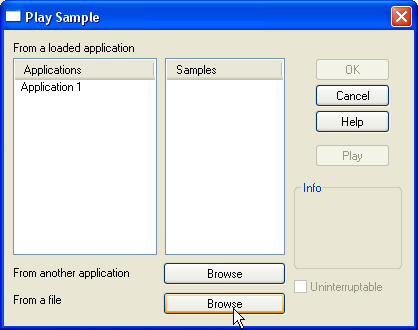 Click on the button "From a file / Browse", this opens a file selector. With this file selector, locate the directory where your version of Clickteam Fusion 2.5 is installed, and open the "Tutorials\ChocoBreak" folder. Several WAV files should be listed, choose the file "POP04.WAV". You can press "Play" to hear the sound. Click on OK.