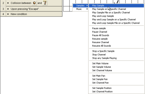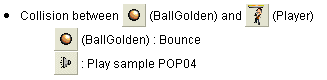 The sound should be identical when the ball collides with any of the sugar objects. Instead of manually defining the Play Sample action for each of the lines, we are going to use drag & drop! This makes our creation much easier and faster. Move your mouse over the "Play sample POP1" action, click and hold the mouse key down to drag it. Now move the mouse to the square just below the first one : you are dragging the action with your mouse to another event line.